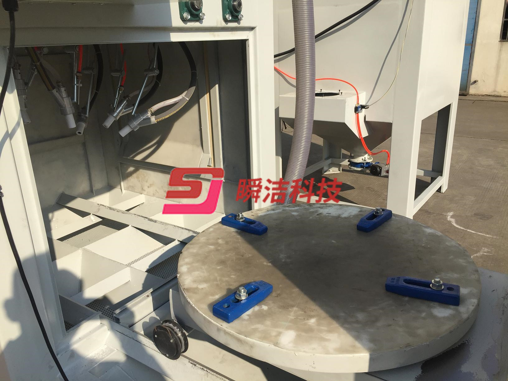 3、 大轉(zhuǎn)盤(pán)連續(xù)轉(zhuǎn)動(dòng),無(wú)極變頻可調(diào),根據(jù)客戶噴砂要求,自行調(diào)整。
