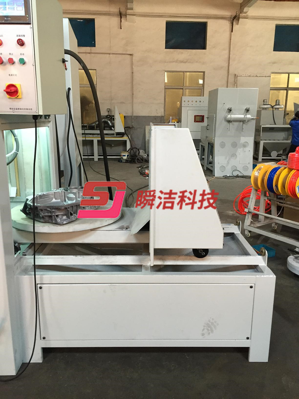 5、 本設(shè)備采用觸摸屏設(shè)計(jì),自動(dòng)化程度高,PLC程序化控制,設(shè)有互鎖裝置、報(bào)警裝置、磨料檢查裝置、等。