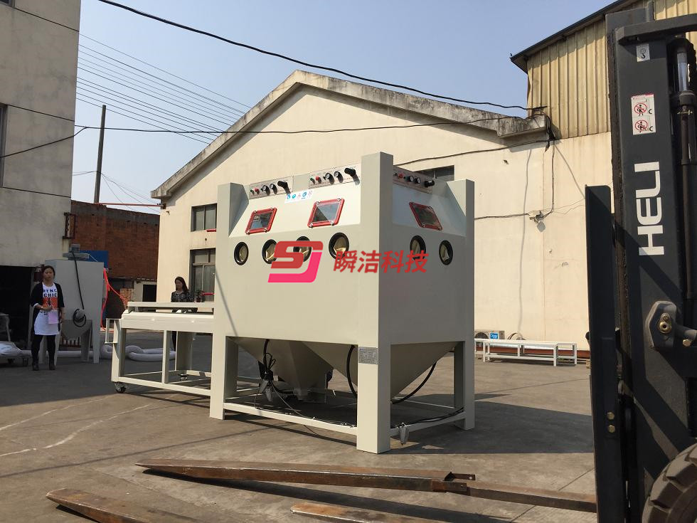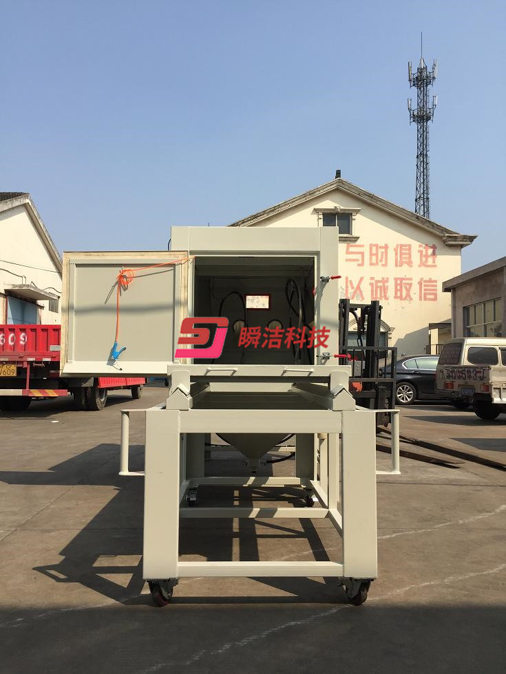 3、配備活動臺車,和轉(zhuǎn)盤,操作時將工件放在轉(zhuǎn)盤上,然后推入機內(nèi)即可噴砂作業(yè),操作簡單省力。