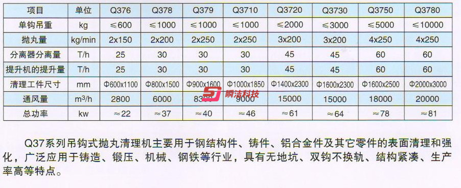 該系列型號拋丸機有Q374單吊鉤式拋丸機、Q376雙吊鉤式拋丸機、Q378雙吊鉤式拋丸機等。